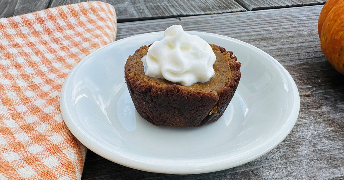 These cozy, bite-sized pumpkin pies combine creamy maple-sweetened pumpkin filling with a spiced gingerbread cookie crust — the perfect blend of fall flavors in every mini cup.